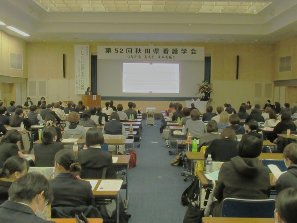令和7年11月19日 第52回秋田県看護学会を開催しました。県内の看護学生を含め141名の皆様にご参加いただき、様々な立場で活躍する看護職が、つながる、支える、未来を拓く を考える機会となりました。特別講演の手島恵先生、特別企画の武藤諒介先生をはじめ、一般演題発表者の方々、実践報告発表者の方々、学会運営に携わったすべての関係者の皆様に心より感謝申し上げます。