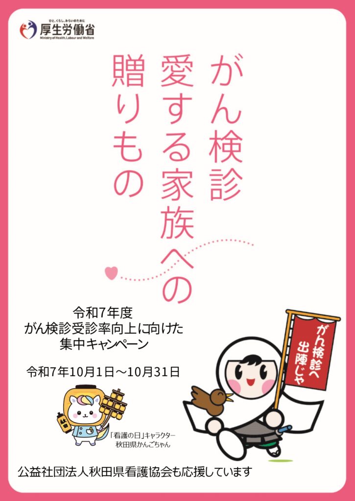 【事務局ⓘ】令和7年度がん検診受診率向上に向けた 集中キャンペーン月間について 2025年10月01日 事務局からのお知らせ 厚生労働省との共催により10月1日(水)から31日(金)までの一か月間を「がん検診受診率向上に向けた集中キャンペーン月間」と定め実施いたします。