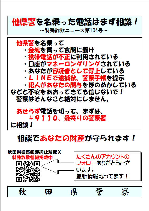 【事務局ⓘ】秋田県警察本部からの情報提供