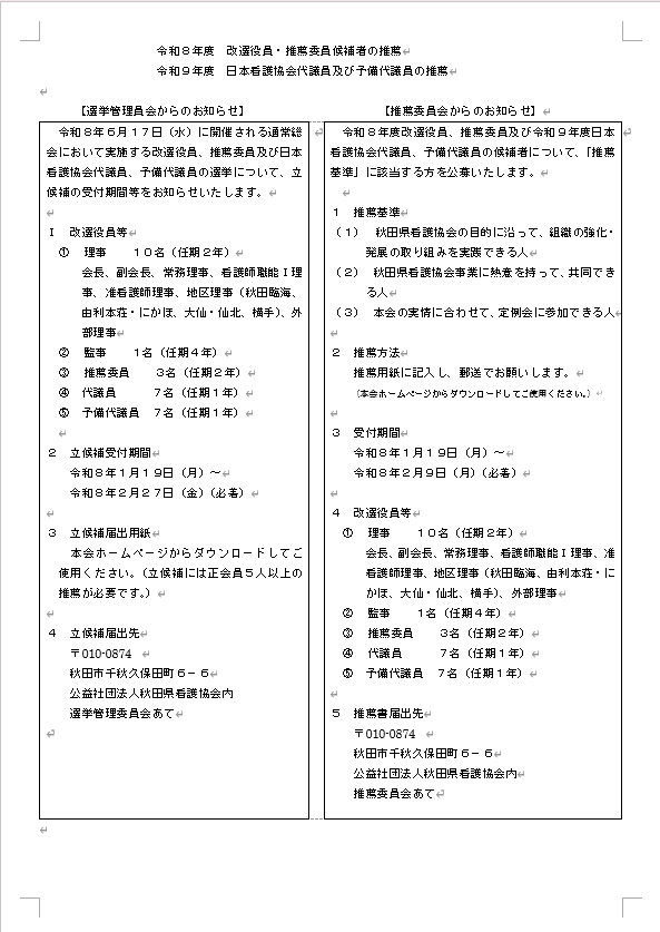 【総務部ⓘ】令和8年度改選役員及び推薦委員の立候補並びに推薦について・令和9年度日本看護協会代議員及び予備代議員の立候補並びに推薦について 2026年01月20日 事務局からのお知らせ 立候補届出用紙 推薦届出用紙