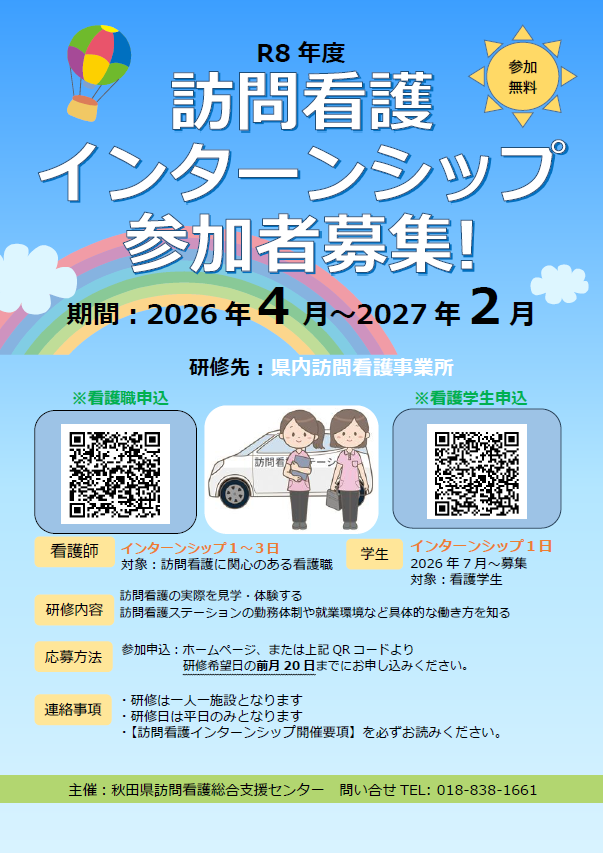 訪問看護は、「すべての年代の方が病気や障がいがあっても住み慣れた地域で、その人らしく、安心して生活できるよう支援する」ことを目指しています。訪問看護に関心を持っている看護学生や看護職の皆様が、これから就職先をリサーチするにあたり、訪問看護を選択肢の一つとして検討していただけるよう職場体験(インターンシップ)を受け入れます。ぜひ、訪問看護を体験してみませんか?