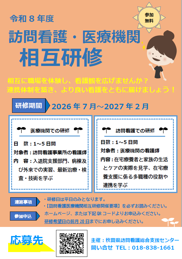 目的:秋田県内の病院等医療機関と訪問看護事業所の看護師が、他機関での研修を通じて相互理解を深め、それぞれの看護の現状・課題や役割を理解し、在宅移行支援に関する連携方法や看護の提供について相互に学ぶ。