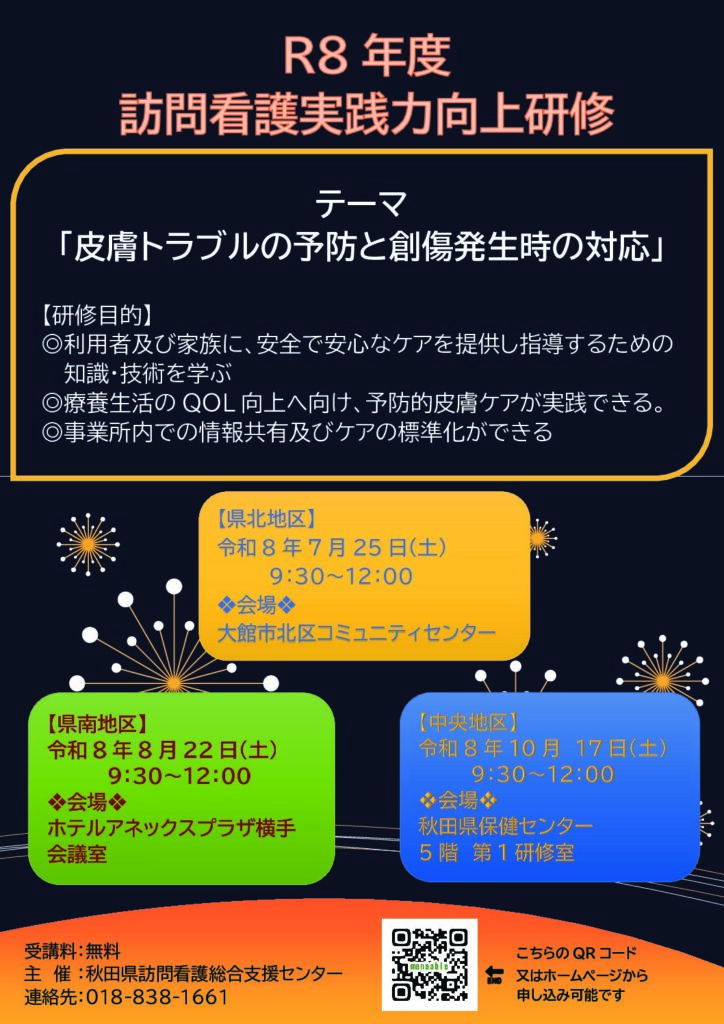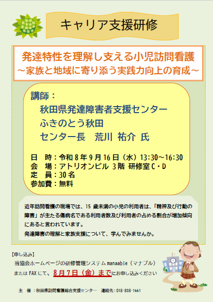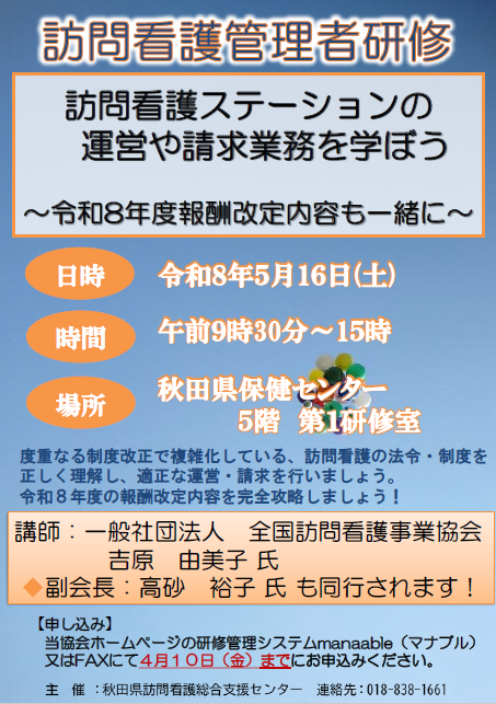 - 本研修は秋田県看護協会事業部が主催しております。誠に恐れ入りますが、当センターホームページのお問い合わせフォームでは研修に関するご質問には対応できません。研修に関するお問い合わせは、秋田県看護協会事業部までお願い致します。