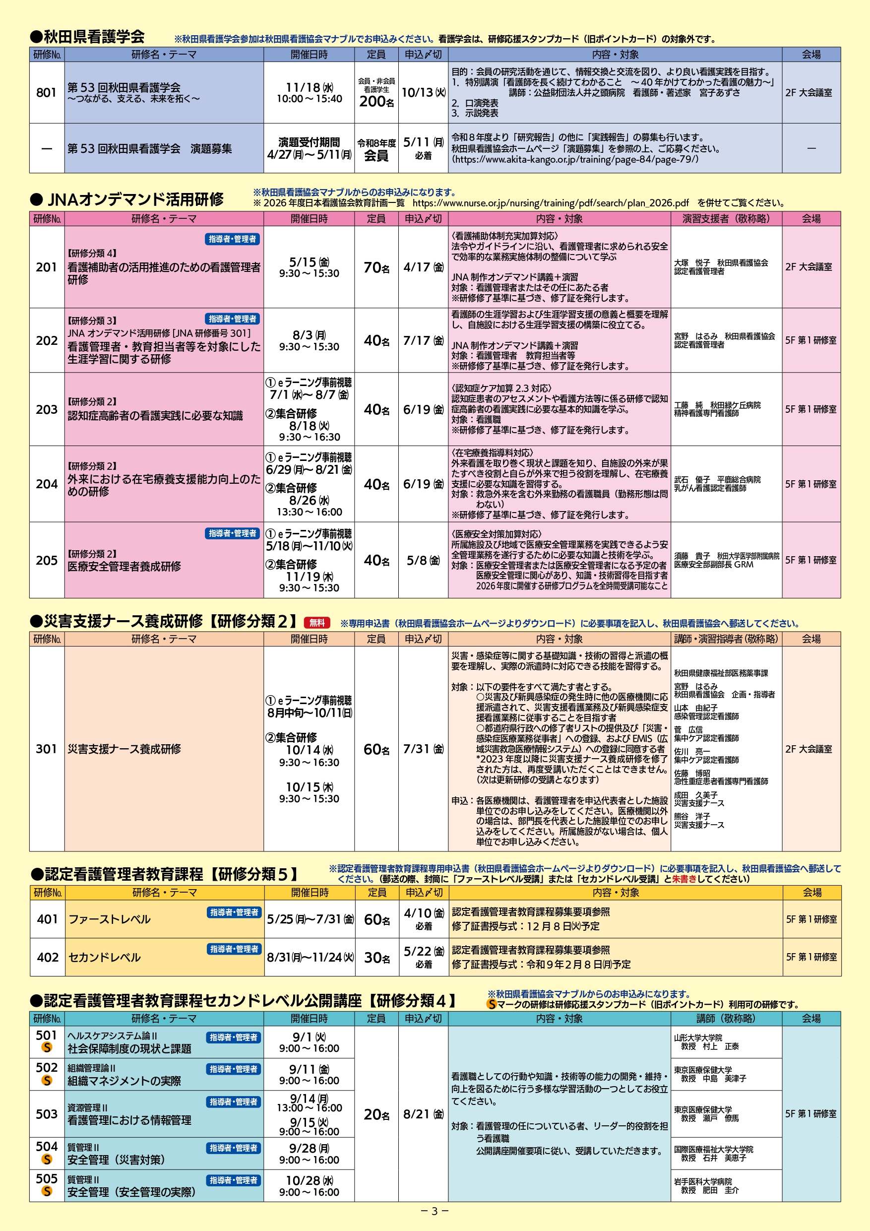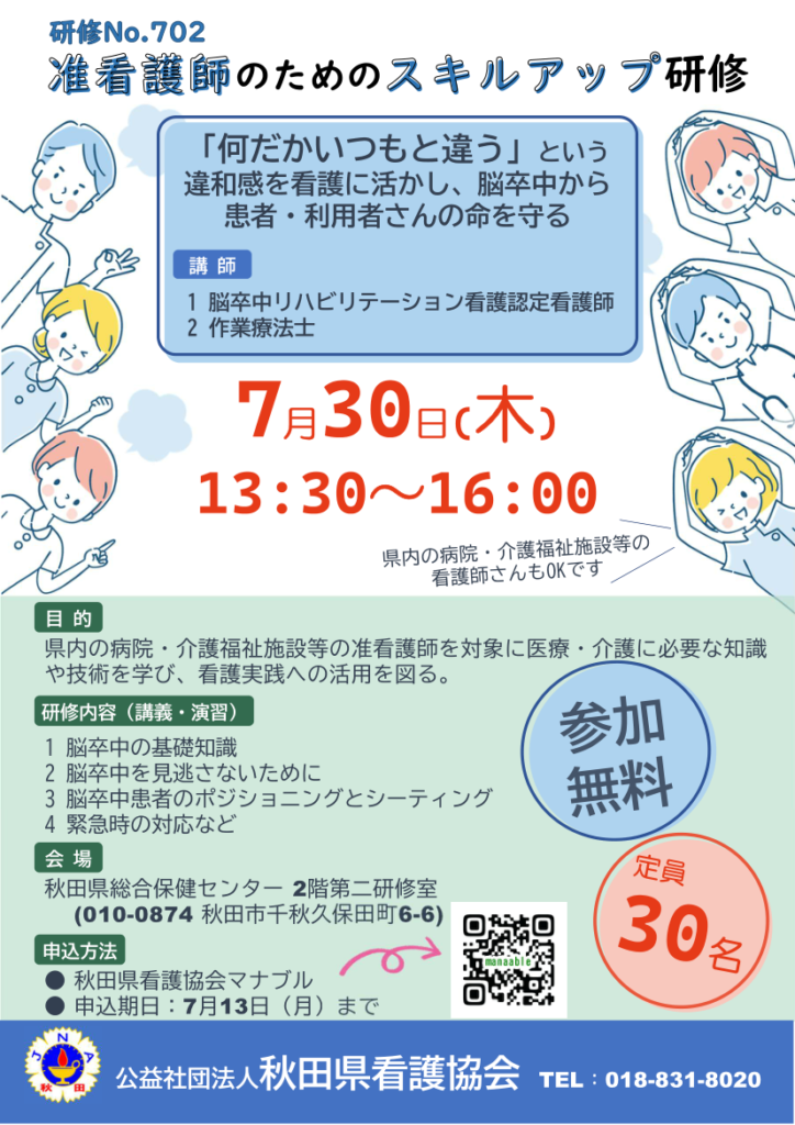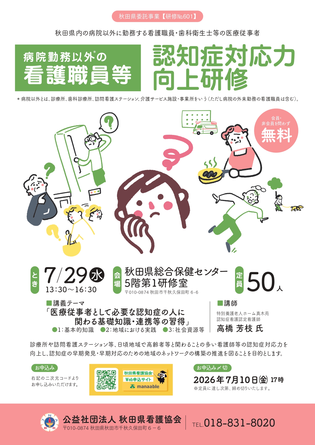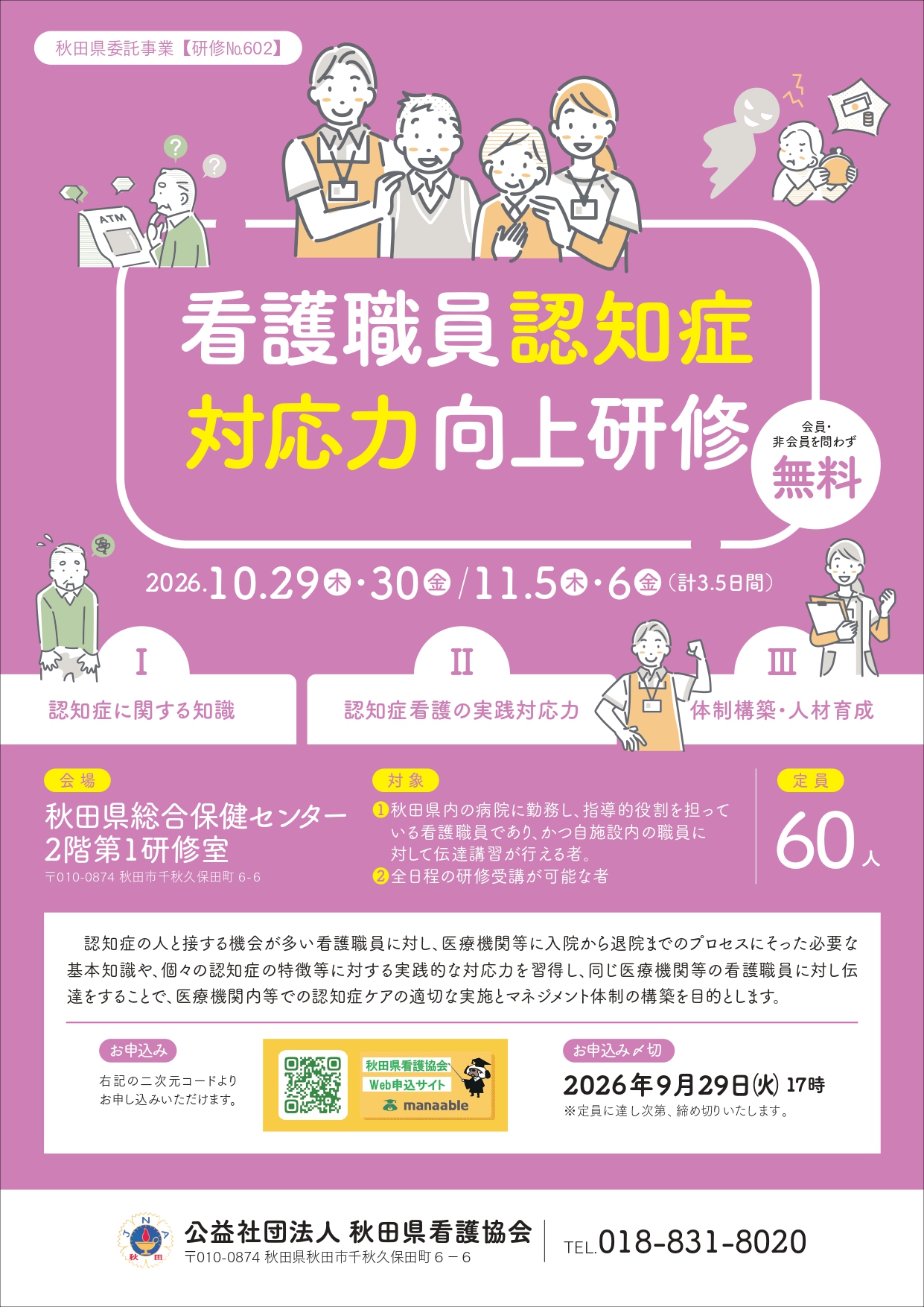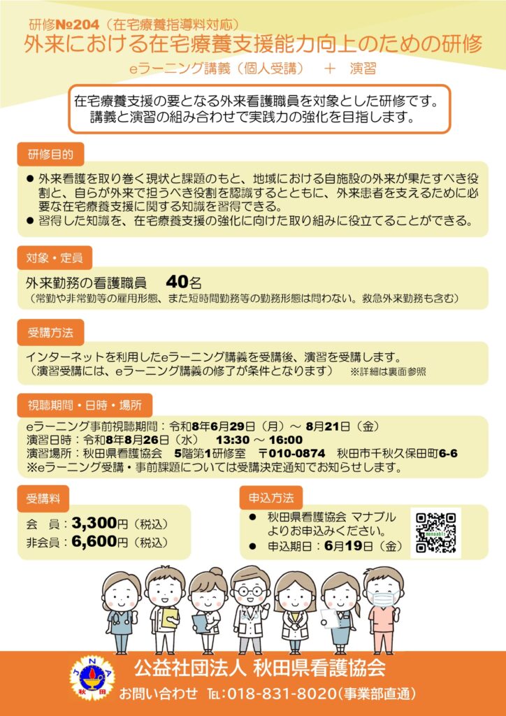 日時:令和8年8月26日㈬ 13:30~16:00(3時間) 会場:秋田県総合保健センター5F 第1研修室 対象:外来勤務の看護職員(常勤や非常勤等の雇用形態、短時間勤務等の勤務形態は問わない。救急外来も含む)