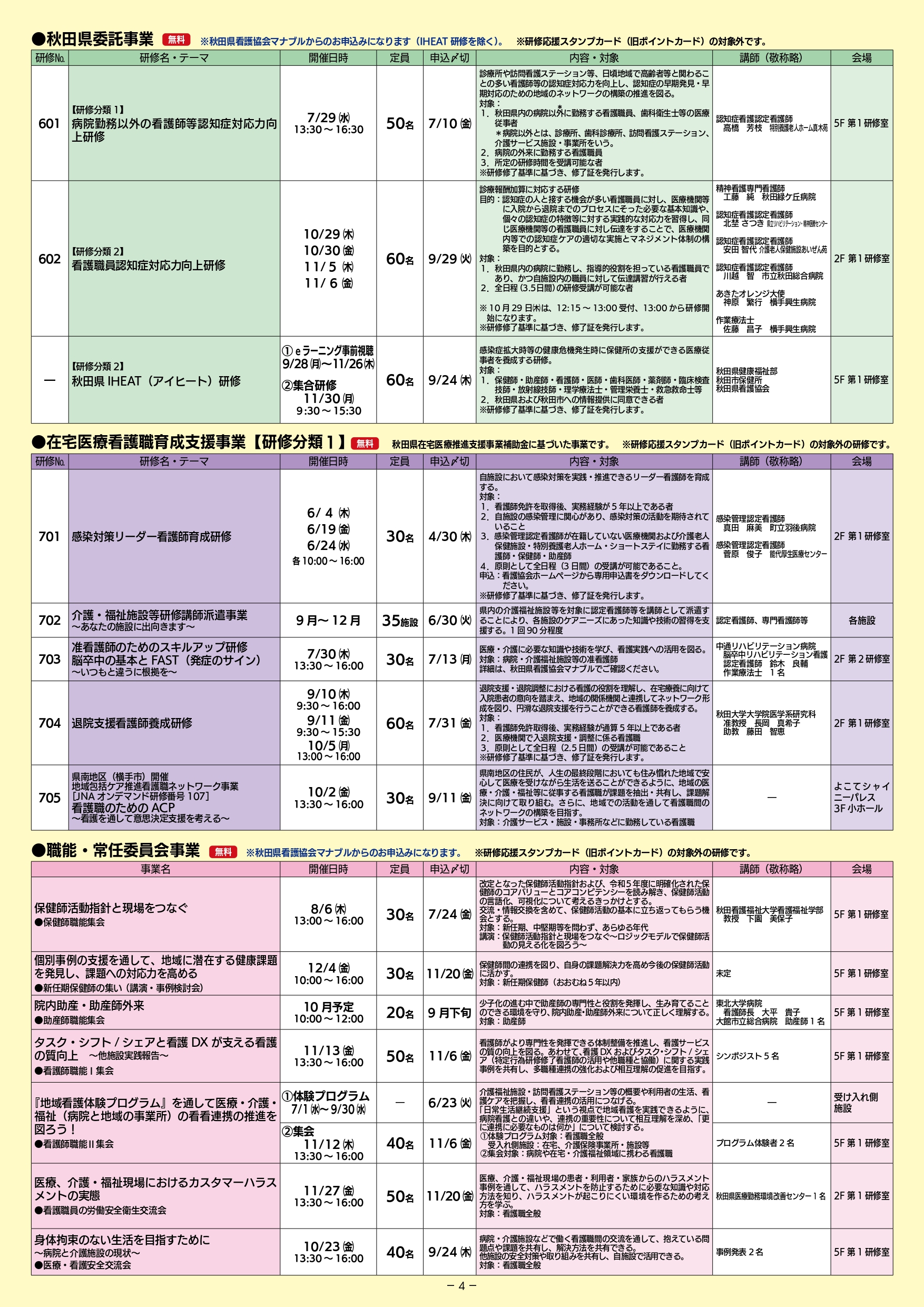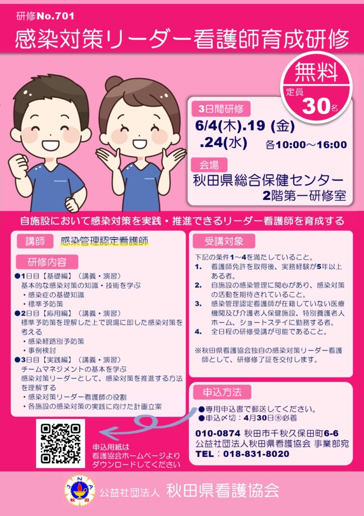 対象:秋田県内の診療所、歯科診療所・訪問看護ステーション、介護サービス施設・事業所等に勤務する看護職員、歯科衛生士等の医療従事者、病院の外来に勤務する看護職員