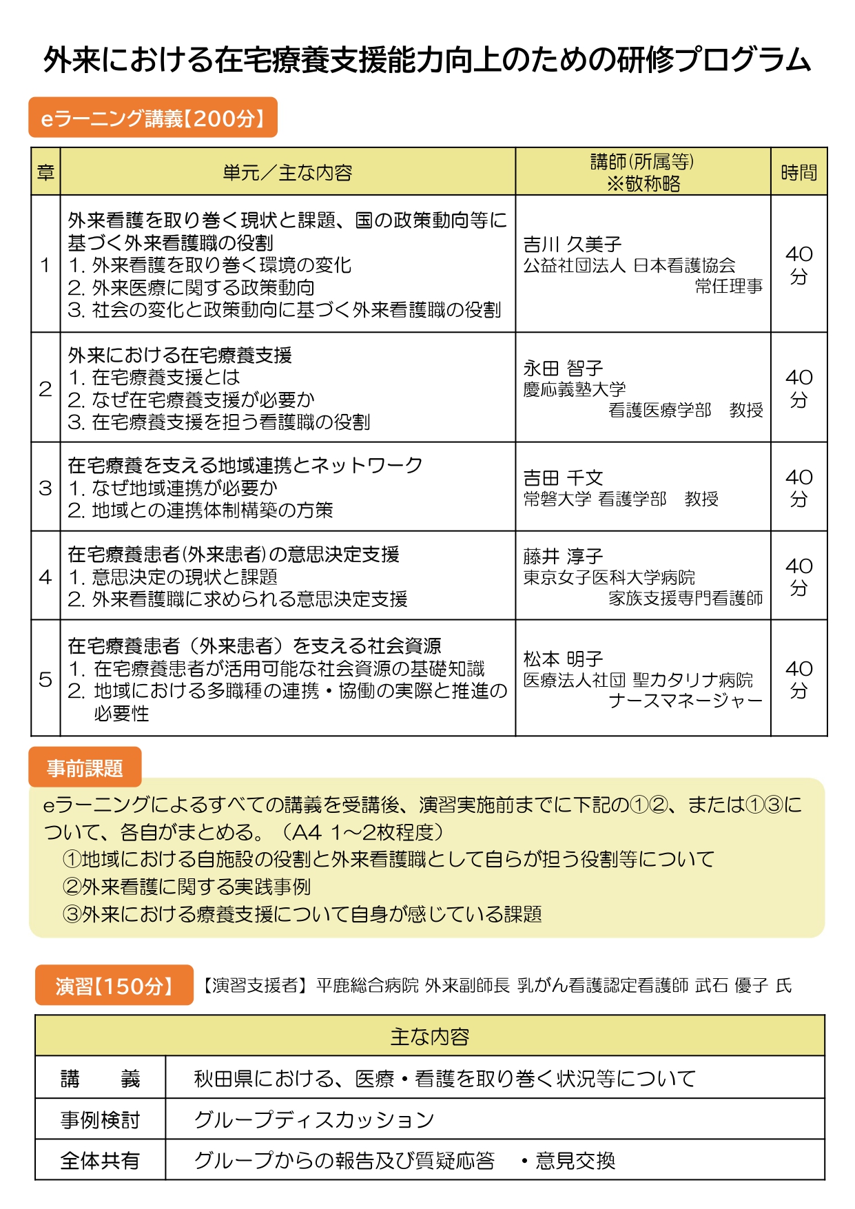 在宅療養支援の要となる外来看護職員を対象とした研修です。講義と演習の組み合わせで実践力の強化を目指します。